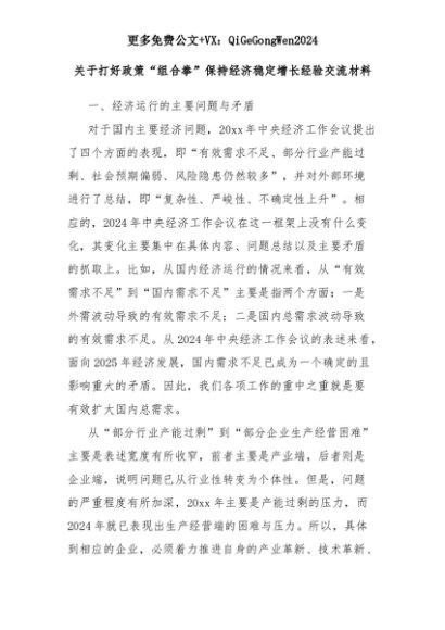 【七哥公文】2025年:关于打好政策“组合拳”保持经济稳定增长经验交流材料+更多免费公文+VX:QiGeGongWen2024+更多免费公文+VX:QiGeGongWen2024