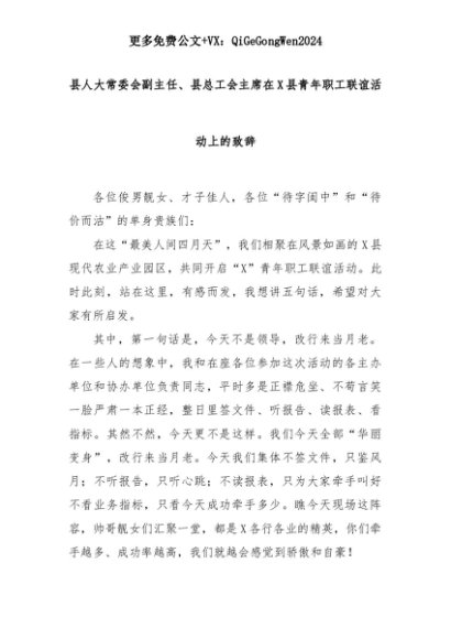 【七哥公文】2025年:县人大常委会副主任、县总工会主席在X县青年职工联谊活动上的致辞+更多免费公文+VX:QiGeGongWen2024+更多免费公文+VX:QiGeGongWen2024