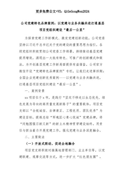 【七哥公文】2025年:公司党建特色品牌案例:以党建与业务共融共进打通基层项目党组织建设“最后一公里”+更多免费公文+VX:QiGeGongWen2024+更多免费公文+VX:QiGeGongWen2024