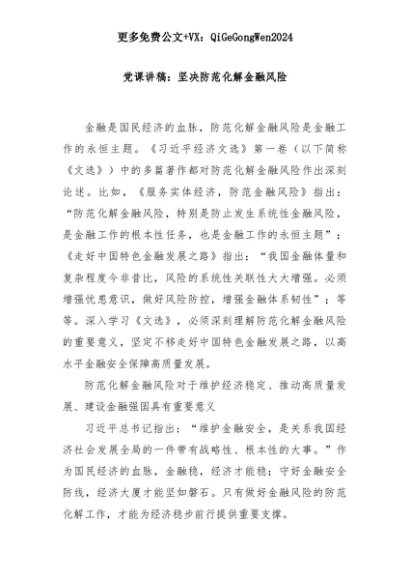 【七哥公文】2025年:党课讲稿:坚决防范化解金融风险+更多免费公文+VX:QiGeGongWen2024+更多免费公文+VX:QiGeGongWen2024