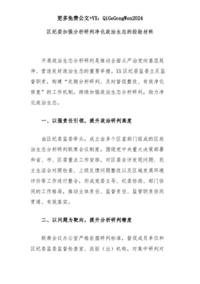 【七哥公文】2025年:区纪委加强分析研判净化政治生态的经验材料+更多免费公文+VX:QiGeGongWen2024+更多免费公文+VX:QiGeGongWen2024