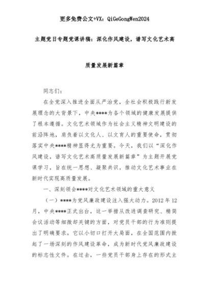 【七哥公文】2025年:主题党日专题党课讲稿:深化作风建设,谱写文化艺术高质量发展新篇章+更多免费公文+VX:QiGeGongWen2024+更多免费公文+VX:QiGeGongWen2024