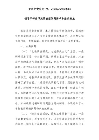 【七哥公文】2025年:领导干部作风建设查摆问题清单和整改措施+更多免费公文+VX:QiGeGongWen2024+更多免费公文+VX:QiGeGongWen2024