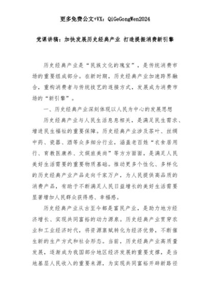 【七哥公文】2025年:党课讲稿:加快发展历史经典产业 打造提振消费新引擎+更多免费公文+VX:QiGeGongWen2024+更多免费公文+VX:QiGeGongWen2024