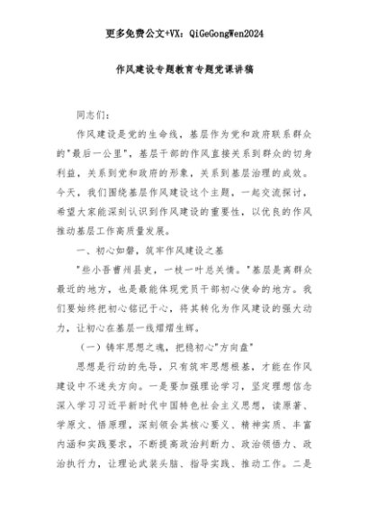 【七哥公文】2025年:作风建设专题教育专题党课讲稿+更多免费公文+VX:QiGeGongWen2024+更多免费公文+VX:QiGeGongWen2024