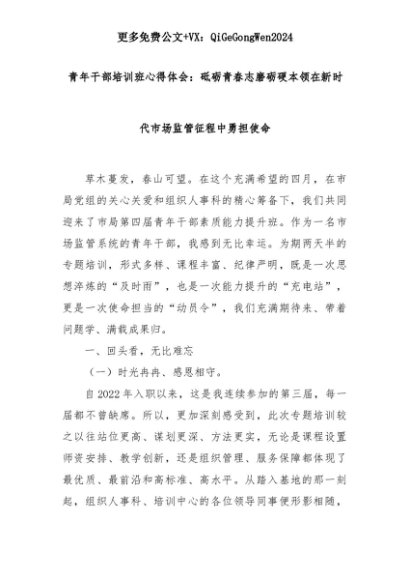 【七哥公文】2025年:青年干部培训班心得体会:砥砺青春志磨砺硬本领在新时代市场监管征程中勇担使命+更多免费公文+VX:QiGeGongWen2024+更多免费公文+VX:QiGeGongWen2024