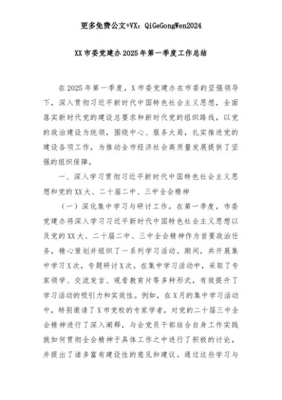 【七哥公文】2025年:XX市委党建办2025年第一季度工作总结+更多免费公文+VX:QiGeGongWen2024+更多免费公文+VX:QiGeGongWen2024