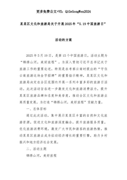 【七哥公文】2025年:某某区文化和旅游局关于开展2025年“5.19中国旅游日”活动的方案+更多免费公文+VX:QiGeGongWen2024+更多免费公文+VX:QiGeGongWen2024