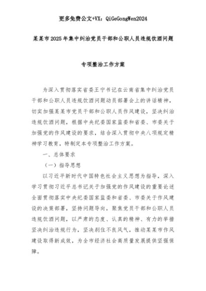 【七哥公文】2025年:某某市2025年集中纠治党员干部和公职人员违规饮酒问题专项整治工作方案+更多免费公文+VX:QiGeGongWen2024+更多免费公文+VX:QiGeGongWen2024
