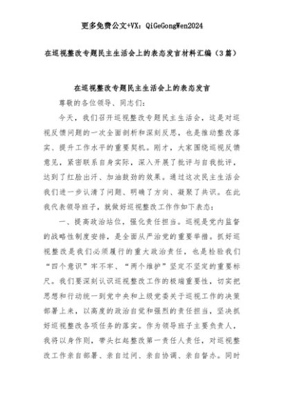 【七哥公文】2025年:(3篇)在巡视整改专题民主生活会上的表态发言材料汇编+更多免费公文+VX:QiGeGongWen2024+更多免费公文+VX:QiGeGongWen2024