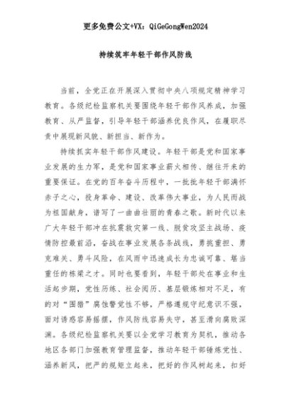 【七哥公文】2025年:持续筑牢年轻干部作风防线+更多免费公文+VX:QiGeGongWen2024+更多免费公文+VX:QiGeGongWen2024