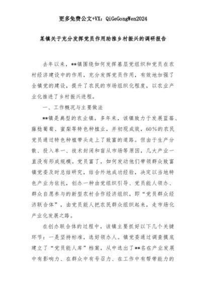 【七哥公文】2025年:某镇关于充分发挥党员作用助推乡村振兴的调研报告+更多免费公文+VX:QiGeGongWen2024+更多免费公文+VX:QiGeGongWen2024