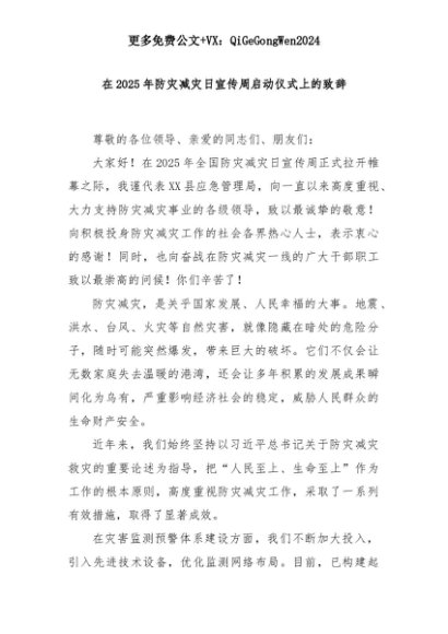 【七哥公文】2025年:在2025年防灾减灾日宣传周启动仪式上的致辞+更多免费公文+VX:QiGeGongWen2024+更多免费公文+VX:QiGeGongWen2024