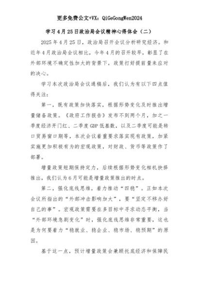 【七哥公文】2025年:学习4月25日政治局会议精神心得体会(二)+更多免费公文+VX:QiGeGongWen2024+更多免费公文+VX:QiGeGongWen2024
