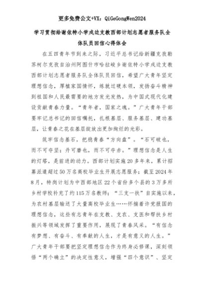 【七哥公文】2025年:学习贯彻给谢依特小学戍边支教西部计划志愿者服务队全体队员回信心得体会+更多免费公文+VX:QiGeGongWen2024+更多免费公文+VX:QiGeGongWen2024