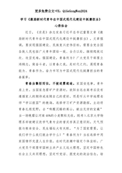 【七哥公文】2025年:学习《激励新时代青年在中国式现代化建设中挺膺担当》心得体会+更多免费公文+VX:QiGeGongWen2024+更多免费公文+VX:QiGeGongWen2024