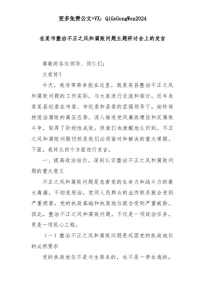 【七哥公文】2025年:在某市整治不正之风和腐败问题主题研讨会上的发言+更多免费公文+VX:QiGeGongWen2024+更多免费公文+VX:QiGeGongWen2024