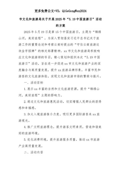 【七哥公文】2025年:市文化和旅游局关于开展2025年“5.19中国旅游日”活动的方案+更多免费公文+VX:QiGeGongWen2024+更多免费公文+VX:QiGeGongWen2024