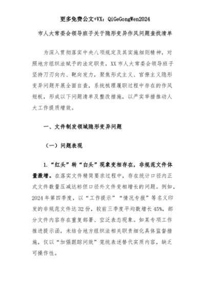 【七哥公文】2025年:市人大常委会领导班子关于隐形变异作风问题查找清单+更多免费公文+VX:QiGeGongWen2024+更多免费公文+VX:QiGeGongWen2024
