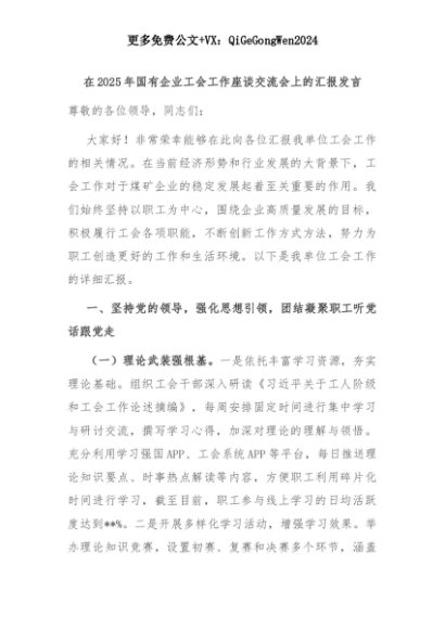 【七哥公文】2025年:在2025年国有企业工会工作座谈交流会上的汇报发言+更多免费公文+VX:QiGeGongWen2024+更多免费公文+VX:QiGeGongWen2024