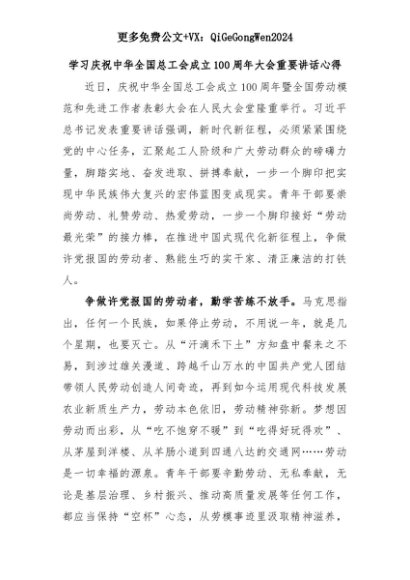 【七哥公文】2025年:学习庆祝中华全国总工会成立100周年大会重要讲话心得+更多免费公文+VX:QiGeGongWen2024+更多免费公文+VX:QiGeGongWen2024