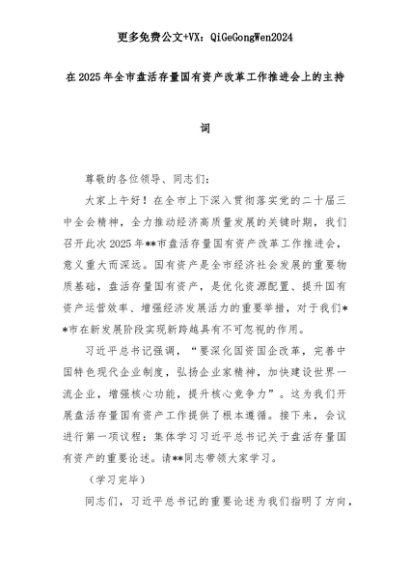 【七哥公文】2025年:在2025年全市盘活存量国有资产改革工作推进会上的主持词+更多免费公文+VX:QiGeGongWen2024+更多免费公文+VX:QiGeGongWen2024