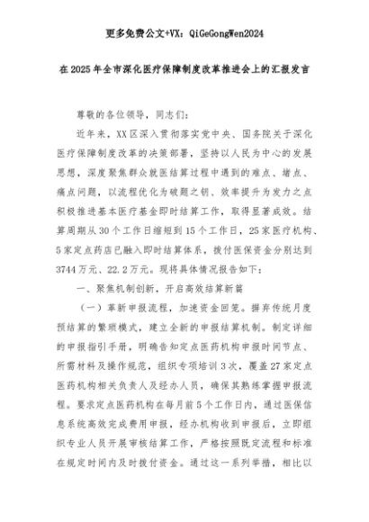 【七哥公文】2025年:在2025年全市深化医疗保障制度改革推进会上的汇报发言+更多免费公文+VX:QiGeGongWen2024+更多免费公文+VX:QiGeGongWen2024