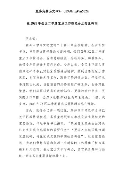 【七哥公文】2025年:在2025年全区二季度重点工作推进会上的主持词+更多免费公文+VX:QiGeGongWen2024+更多免费公文+VX:QiGeGongWen2024