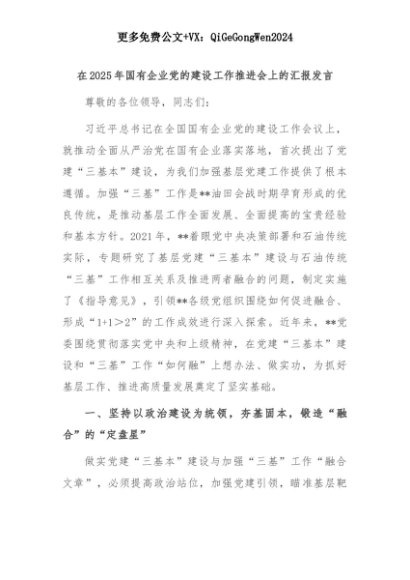 【七哥公文】2025年:在2025年国有企业党的建设工作推进会上的汇报发言+更多免费公文+VX:QiGeGongWen2024+更多免费公文+VX:QiGeGongWen2024