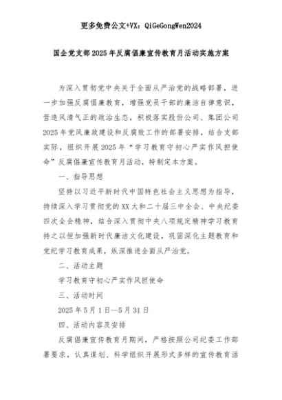 【七哥公文】2025年:国企党支部2025年反腐倡廉宣传教育月活动实施方案+更多免费公文+VX:QiGeGongWen2024+更多免费公文+VX:QiGeGongWen2024