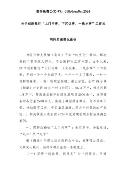 【七哥公文】2025年:关于创新推行“上门问事、下沉议事、一线办事”工作机制的实施情况报告+更多免费公文+VX:QiGeGongWen2024+更多免费公文+VX:QiGeGongWen2024