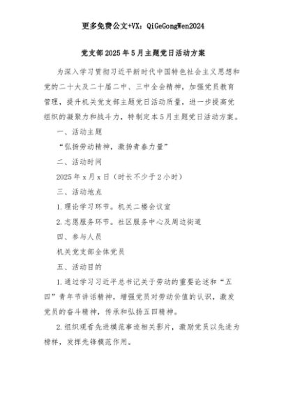 【七哥公文】2025年:党支部2025年5月主题党日活动方案+更多免费公文+VX:QiGeGongWen2024+更多免费公文+VX:QiGeGongWen2024