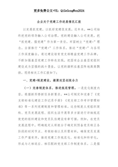 【七哥公文】2025年:企业关于党建工作进展情况汇报+更多免费公文+VX:QiGeGongWen2024+更多免费公文+VX:QiGeGongWen2024