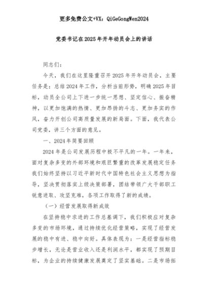 【七哥公文】2025年:党委书记在2025年开年动员会上的讲话+更多免费公文+VX:QiGeGongWen2024+更多免费公文+VX:QiGeGongWen2024