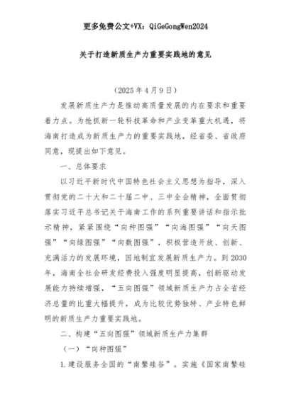 【七哥公文】2025年:关于打造新质生产力重要实践地的意见+更多免费公文+VX:QiGeGongWen2024+更多免费公文+VX:QiGeGongWen2024