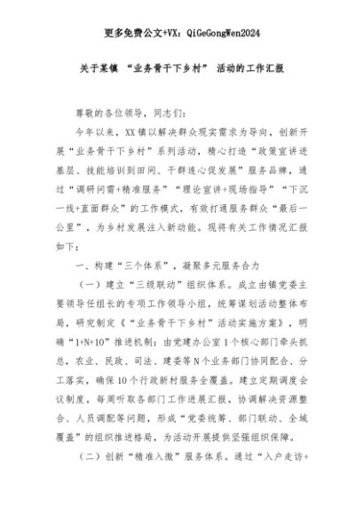 【七哥公文】2025年:关于某镇 “业务骨干下乡村” 活动的工作汇报+更多免费公文+VX:QiGeGongWen2024+更多免费公文+VX:QiGeGongWen2024
