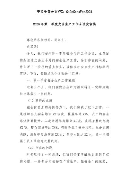 【七哥公文】2025年:2025年第一季度安全生产工作会议发言稿+更多免费公文+VX:QiGeGongWen2024+更多免费公文+VX:QiGeGongWen2024