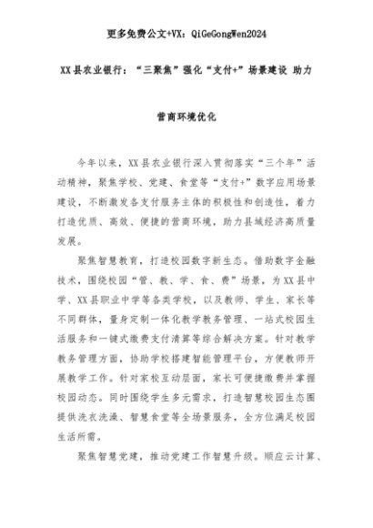 【七哥公文】2025年:XX县农业银行:“三聚焦”强化“支付+”场景建设 助力营商环境优化+更多免费公文+VX:QiGeGongWen2024+更多免费公文+VX:QiGeGongWen2024