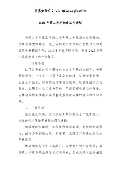 【七哥公文】2025年:2025年第二季度党建工作计划+更多免费公文+VX:QiGeGongWen2024+更多免费公文+VX:QiGeGongWen2024