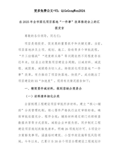 【七哥公文】2025年:在2025年全市深化项目落地“一件事”改革推进会上的汇报发言+更多免费公文+VX:QiGeGongWen2024+更多免费公文+VX:QiGeGongWen2024