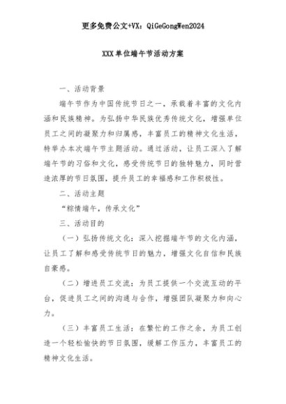 【七哥公文】2025年:XXX单位端午节活动方案+更多免费公文+VX:QiGeGongWen2024+更多免费公文+VX:QiGeGongWen2024