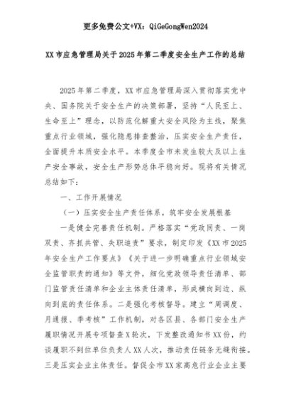 【七哥公文】2025年:XX市应急管理局关于2025年第二季度安全生产工作的总结+更多免费公文+VX:QiGeGongWen2024+更多免费公文+VX:QiGeGongWen2024