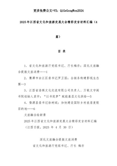 【七哥公文】2025年:(4篇)2025年江西省文化和旅游发展大会精彩发言材料汇编+更多免费公文+VX:QiGeGongWen2024+更多免费公文+VX:QiGeGongWen2024
