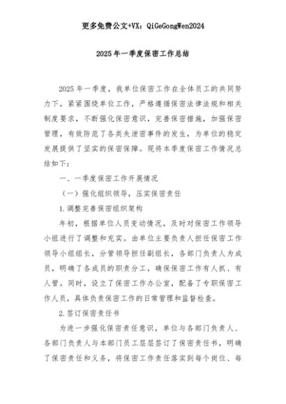 【七哥公文】2025年:2025年一季度保密工作总结+更多免费公文+VX:QiGeGongWen2024+更多免费公文+VX:QiGeGongWen2024