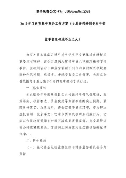 【七哥公文】2025年:Xx县学习教育集中整治工作方案(乡村振兴特别是村干部监督管理领域不正之风)+更多免费公文+VX:QiGeGongWen2024+更多免费公文+VX:QiGeGongWen2024