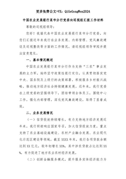 【七哥公文】2025年:中国农业发展银行某市分行党委向巡视组汇报工作材料+更多免费公文+VX:QiGeGongWen2024+更多免费公文+VX:QiGeGongWen2024