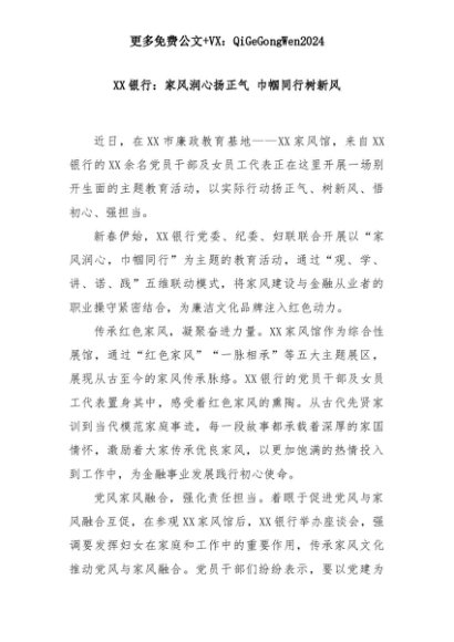【七哥公文】2025年:XX银行:家风润心扬正气 巾帼同行树新风+更多免费公文+VX:QiGeGongWen2024+更多免费公文+VX:QiGeGongWen2024