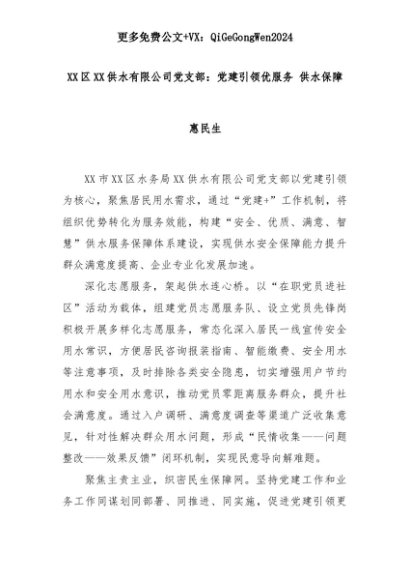 【七哥公文】2025年:XX区XX供水有限公司党支部:党建引领优服务 供水保障惠民生+更多免费公文+VX:QiGeGongWen2024+更多免费公文+VX:QiGeGongWen2024
