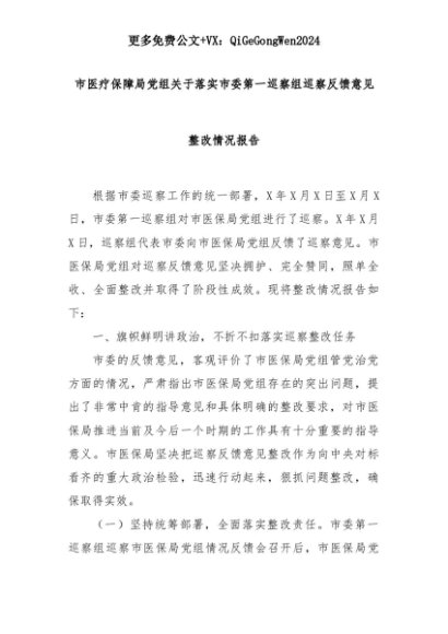 【七哥公文】2025年:市医疗保障局党组关于落实市委第一巡察组巡察反馈意见整改情况报告+更多免费公文+VX:QiGeGongWen2024+更多免费公文+VX:QiGeGongWen2024