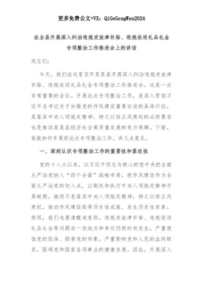 【七哥公文】2025年:在全县开展深入纠治违规发放津补贴、违规收送礼品礼金专项整治工作推进会上的讲话+更多免费公文+VX:QiGeGongWen2024+更多免费公文+VX:QiGeGongWen2024